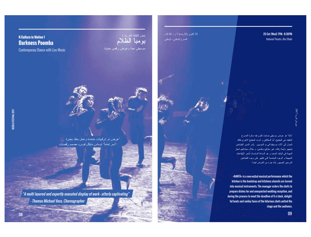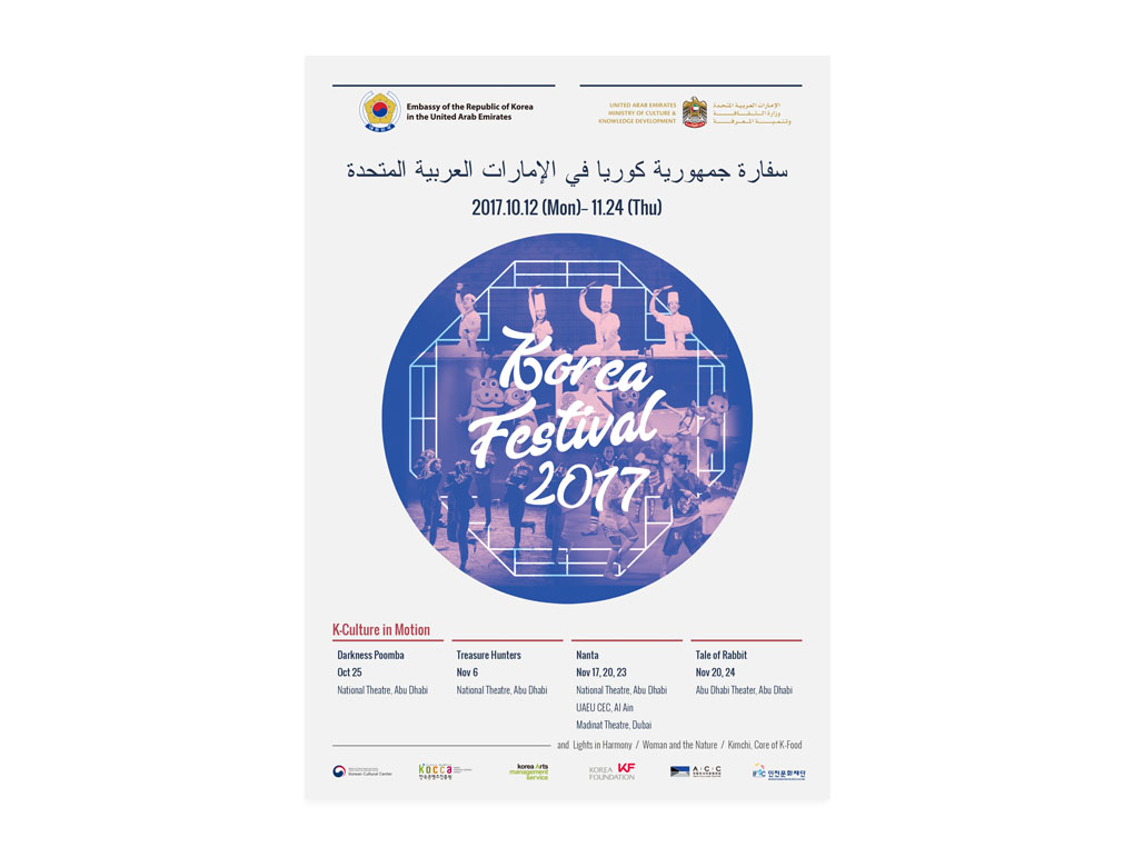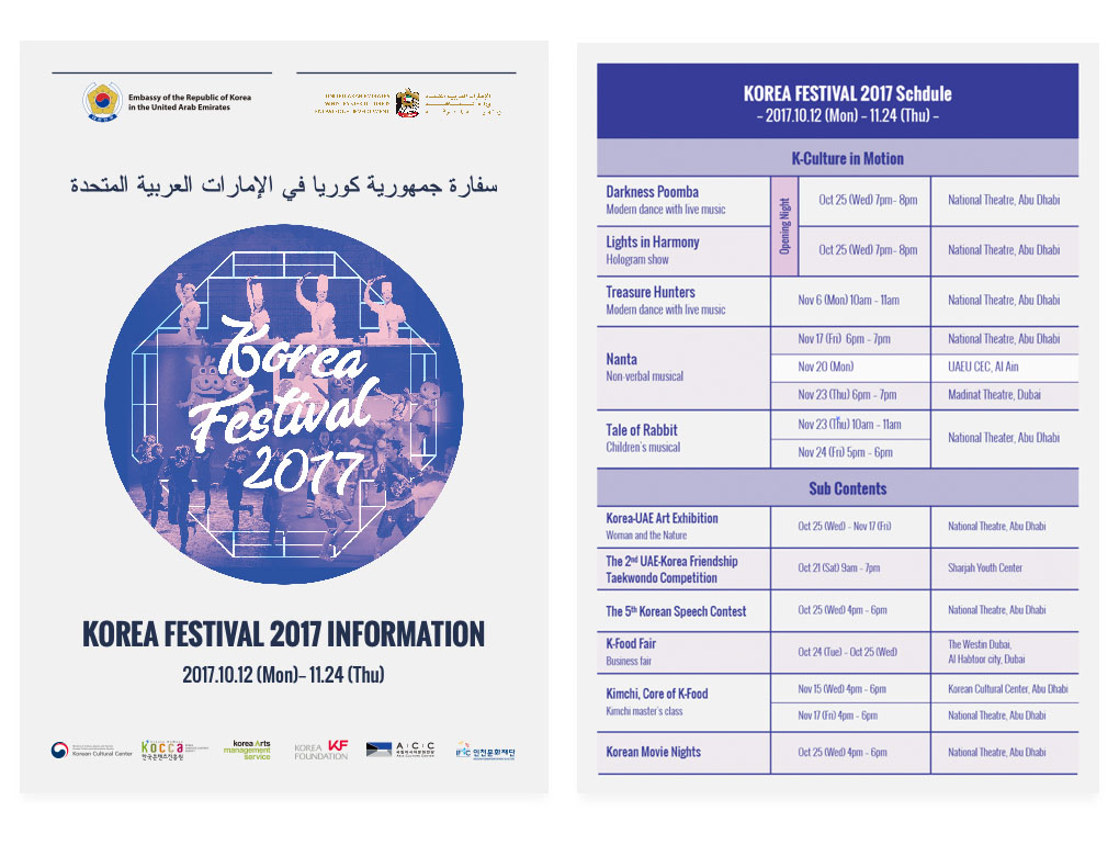 UAE 소재 한국문화원에서 주최한 KOREA FESTIVAL 2017의 홍보자료 디자인 작업을 진행하였습니다.