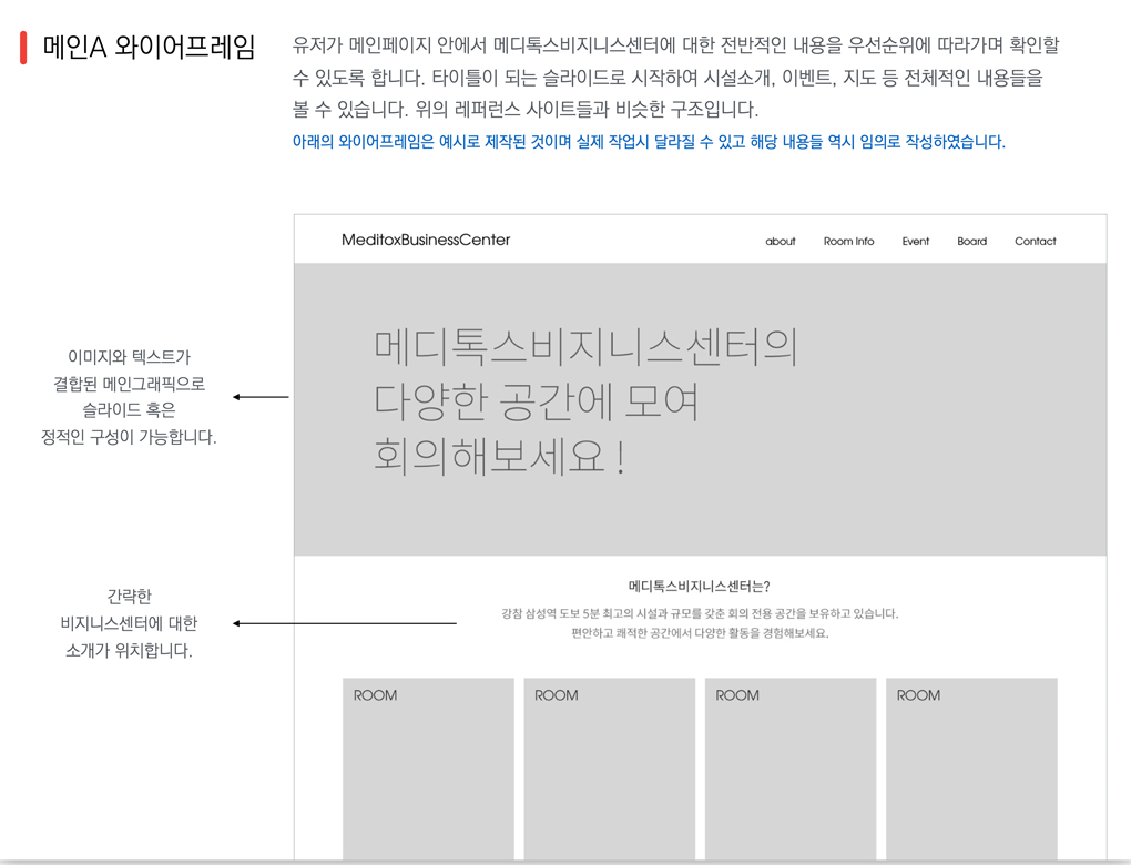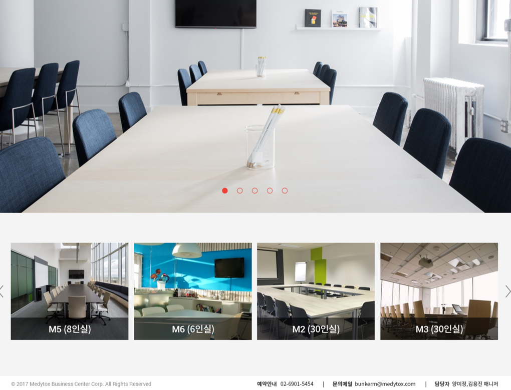 메디톡스(주)에서 본사 건물 지하1층에 자회사를 설립하여 공간대여가 가능한 서비스를 시작하며 그를 위한 안내,예약이 가능한 웹사이트를 제작하였습니다.